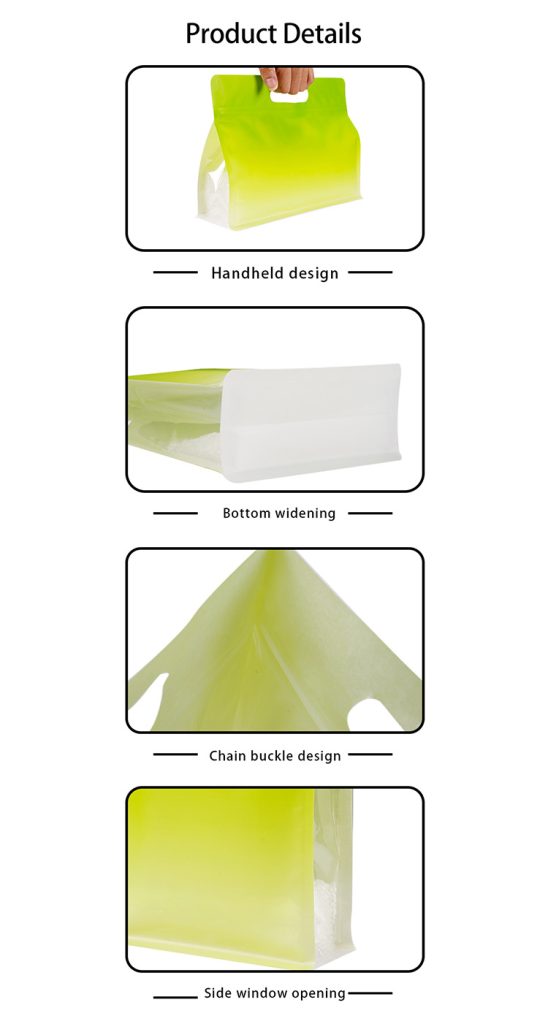 Гэты самазапячатвальны пакет мае канструкцыю ручкі, якая робіць яго больш натуральным для спажыўцоў пры пераноске, а тэхналогія самазапячатвальнай палоскі надзейна фіксуе свежасць прадукту.